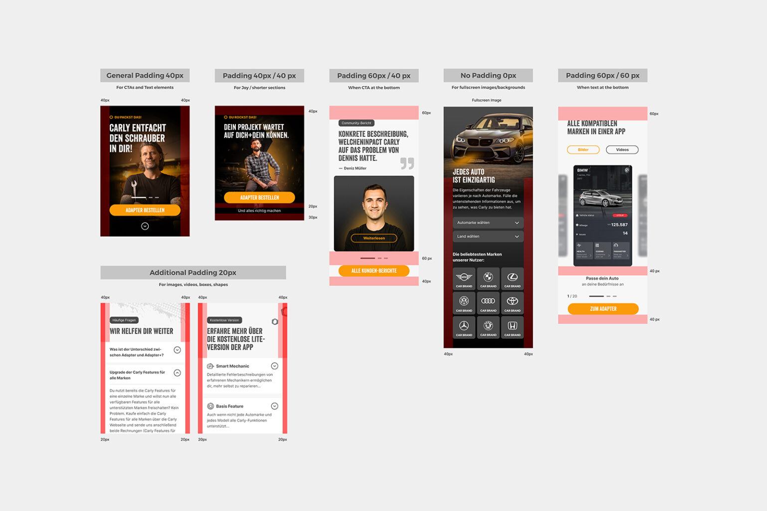 Carly wollte kein Webdesign, dass sich Unterseite für Unterseite spezifisch und individuell aufbaut – Carly wollte ein modulares Design, welches auf Widgets basiert. Mit diesen kann der jeweilige Seitenaufbau nun selbst individuell bestimmt und verändert werden – ganz nach den Needs von Carly. Hierbei könnt ihr die Widgets sehen – sowie auch pixelperfekte Bemaßung von unserem Designteam, als Vorlage & Hilfe für die IT.