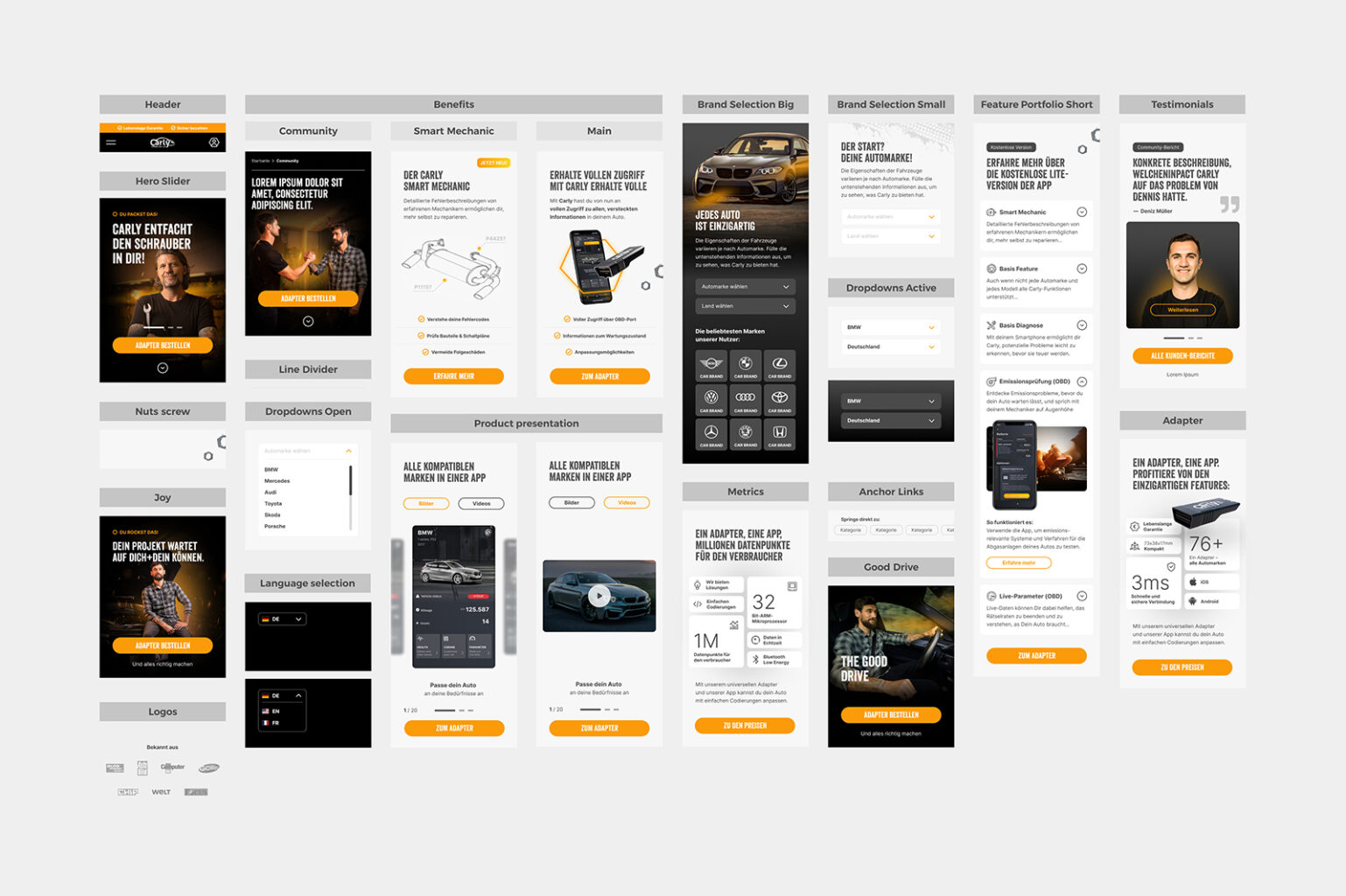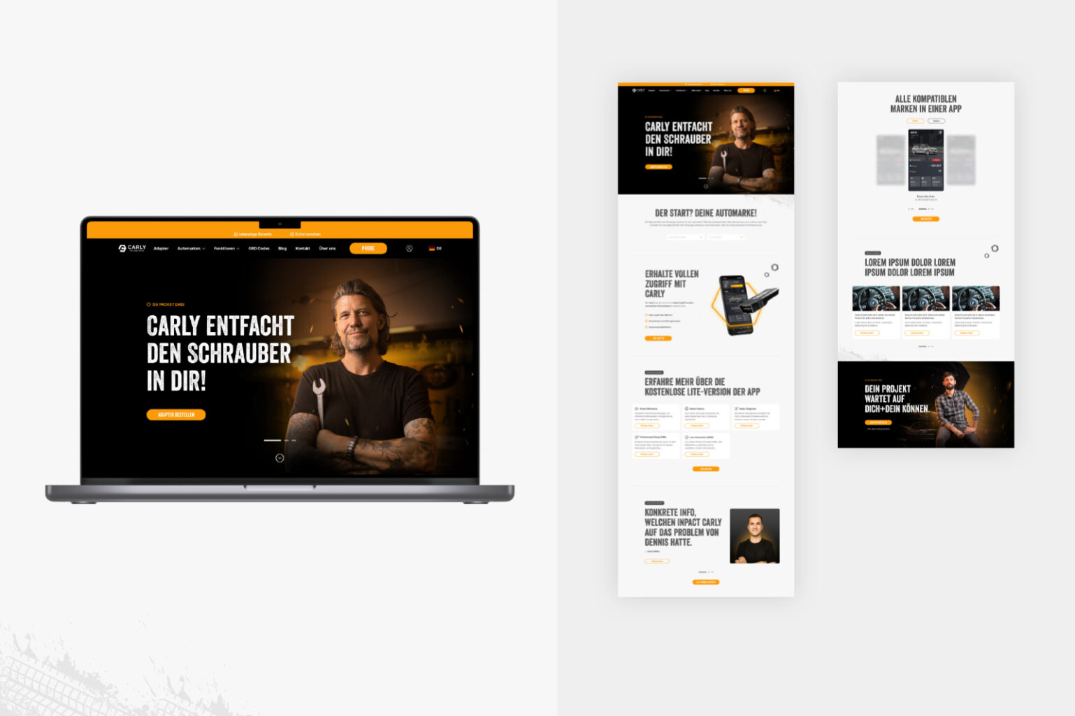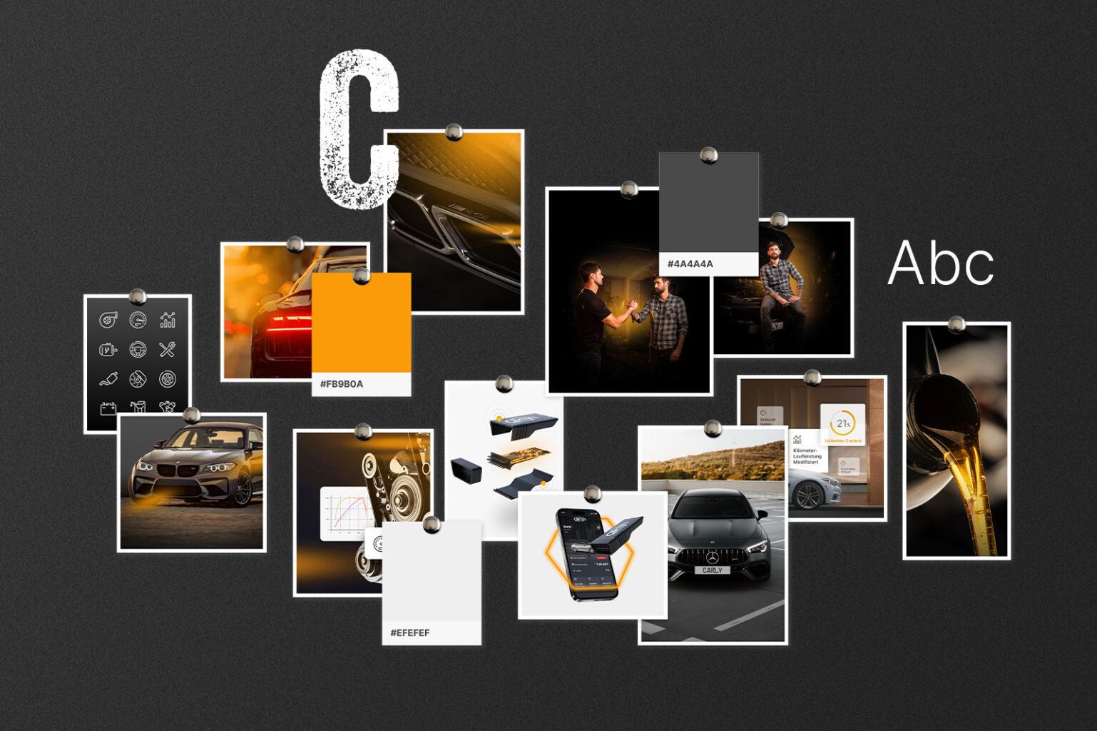 Aus den Moodboards konnten wir gemeinsam in kurzer Zeit fest machen, wie wir künftig bestehende und potentielle Carly-Kunden visuell abholen möchten – mit Ecken und Kanten, dreckigen Händen aber mit smarter Technik, die wirklich weiterhilft. Dabei haben wir agenturseitig folgende Elemente definiert und gestaltet: