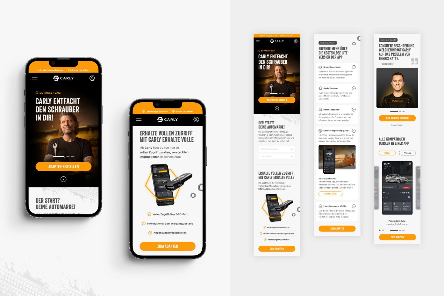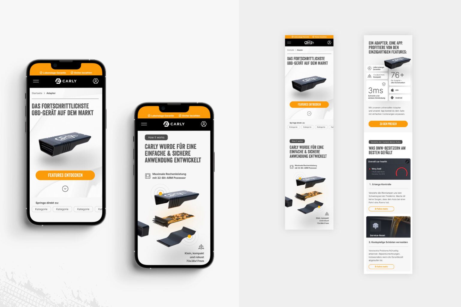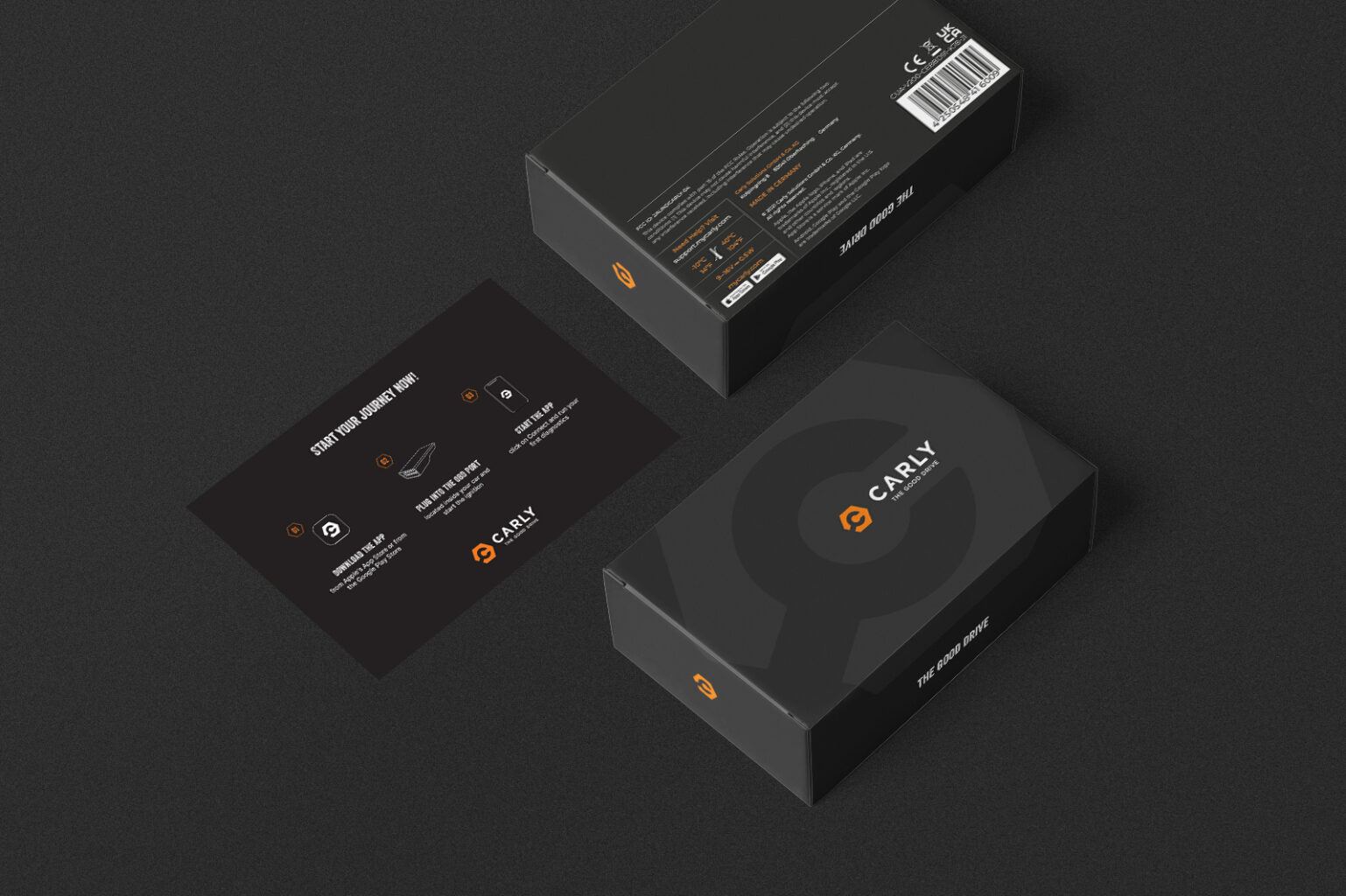 Mit einem umfangreichen Redesign des Brandings kommen viele Anpassungen einher und so ziehen wir als letzten Step verschiedene Produkte/Elemente für Carly nach. So gestalteten wir z. B. den OBD-Stecker selbst neu, die Verpackung des Steckers oder aber auch den App-Store, in dem die APP erklärt und zum Download angeboten wird. Selbstverständlich haben wir hierbei beide Stores, also iOS sowie Google Play berücksichtigt.