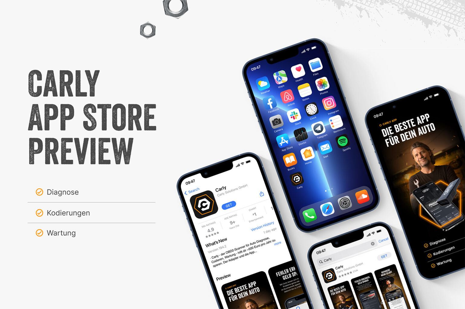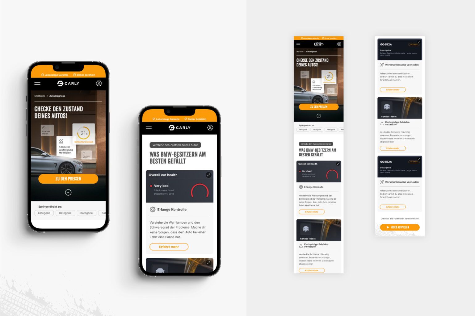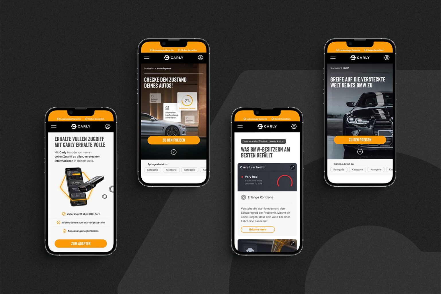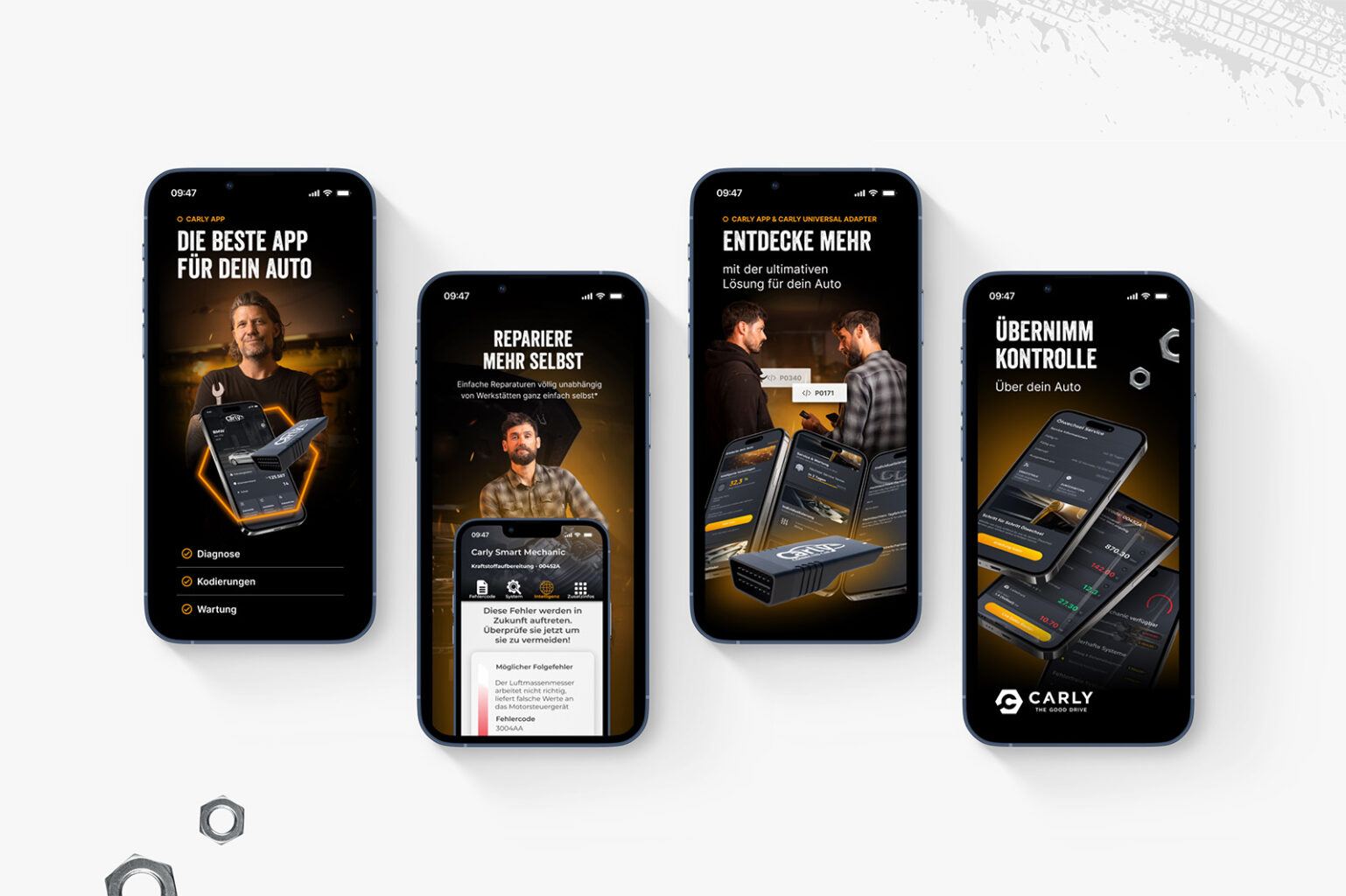Mit einem umfangreichen Redesign des Brandings kommen viele Anpassungen einher und so ziehen wir als letzten Step verschiedene Produkte/Elemente für Carly nach. So gestalteten wir z. B. den OBD-Stecker selbst neu, die Verpackung des Steckers oder aber auch den App-Store, in dem die APP erklärt und zum Download angeboten wird. Selbstverständlich haben wir hierbei beide Stores, also iOS sowie Google Play berücksichtigt.