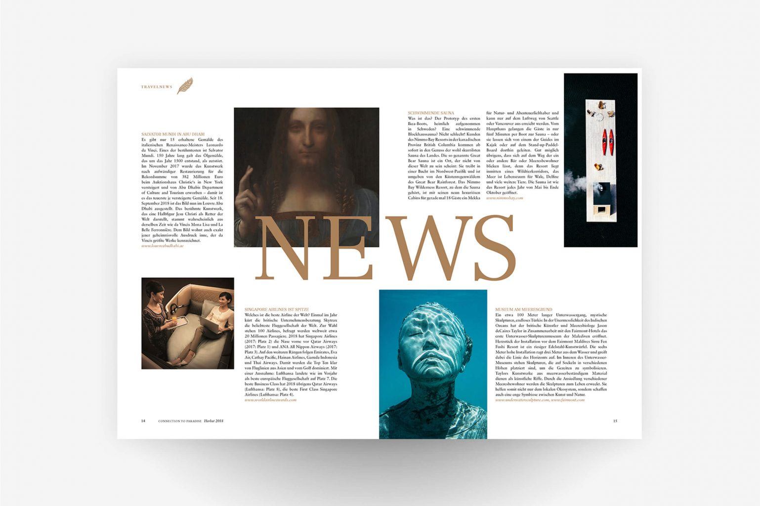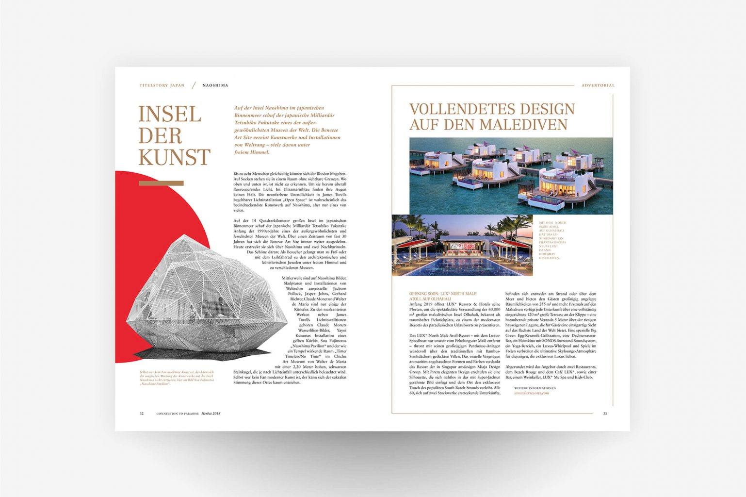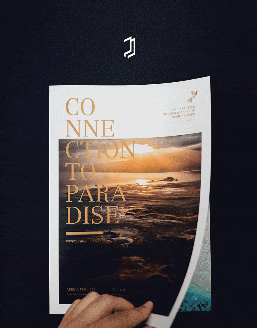 DESIGNREISEN liefert eine individuelle, persönliche Beratung durch die hauseigenen Reisedesigner und ermöglichen so ihren Kunden seit vielen Jahren eine unvergessliche Reise, die defintiv im Gedächtnis bleibt. Um regelmäßig Bestands- und Neukunden mit innovativen Reisestories und dem 100%igen Fernweh an zu stecken, entwickelt Pixelperfektion das passende Editorialdesign für das Kundenmagazin Connection to Paradise.