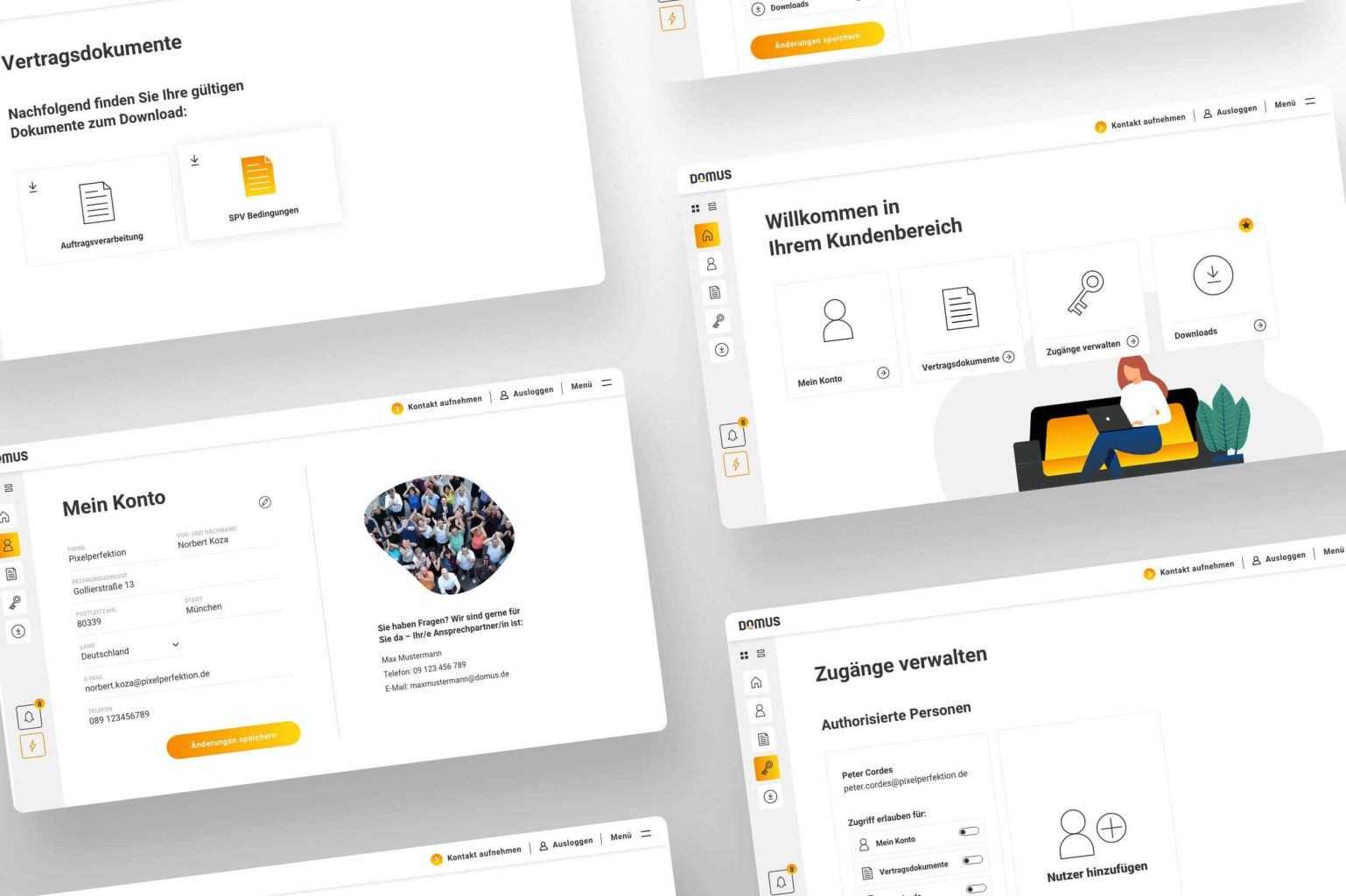 Technisch spannender als der Produktkonfigurator ist aus unserer Sicht der frisch aktualisierte Kundenbereich der DOMUS Software AG. Visuell grenzt sich dieser bewusst nach dem Login des Users vom Rest des Webdesigns ab – hier dominiert Weiß. Der Nutzer ist in seinem persönlichen Bereich angekommen, in welchem Mitarbeiter & autorisierte Personen verwaltet werden können, Kundendaten bequem geändert werden können oder die passende Software Ihren Weg in den Download-Folder findet.