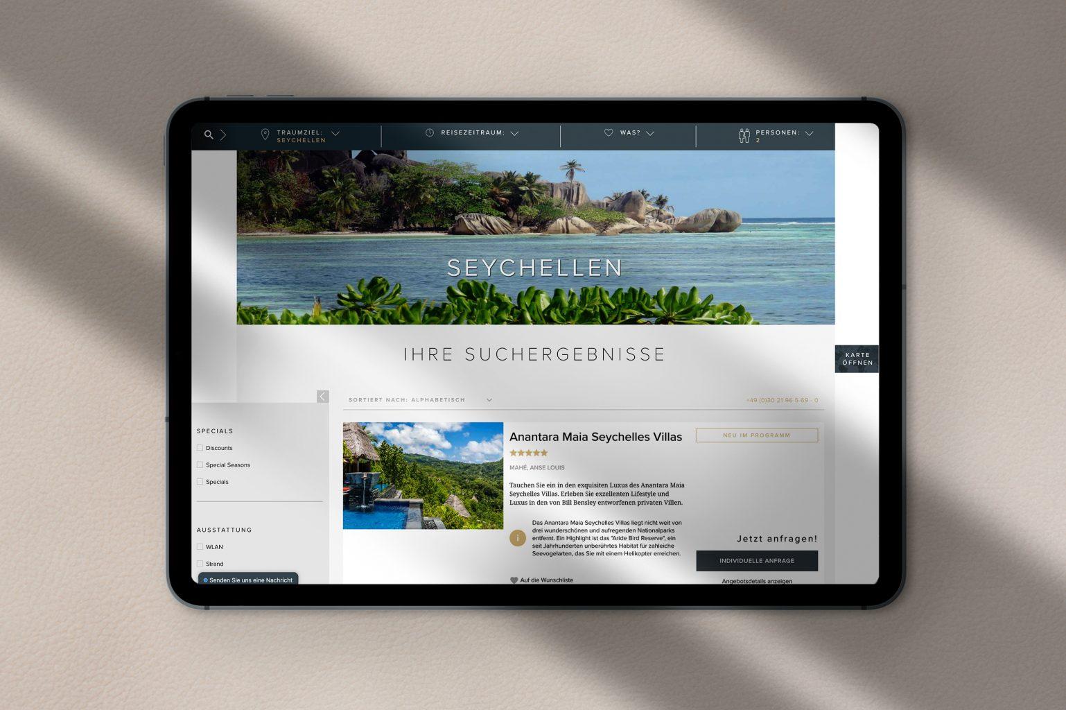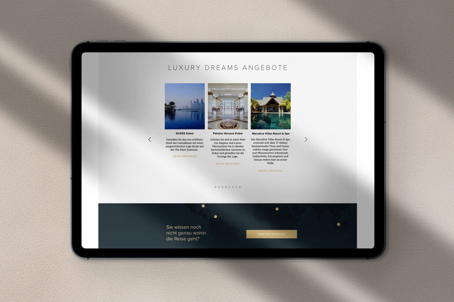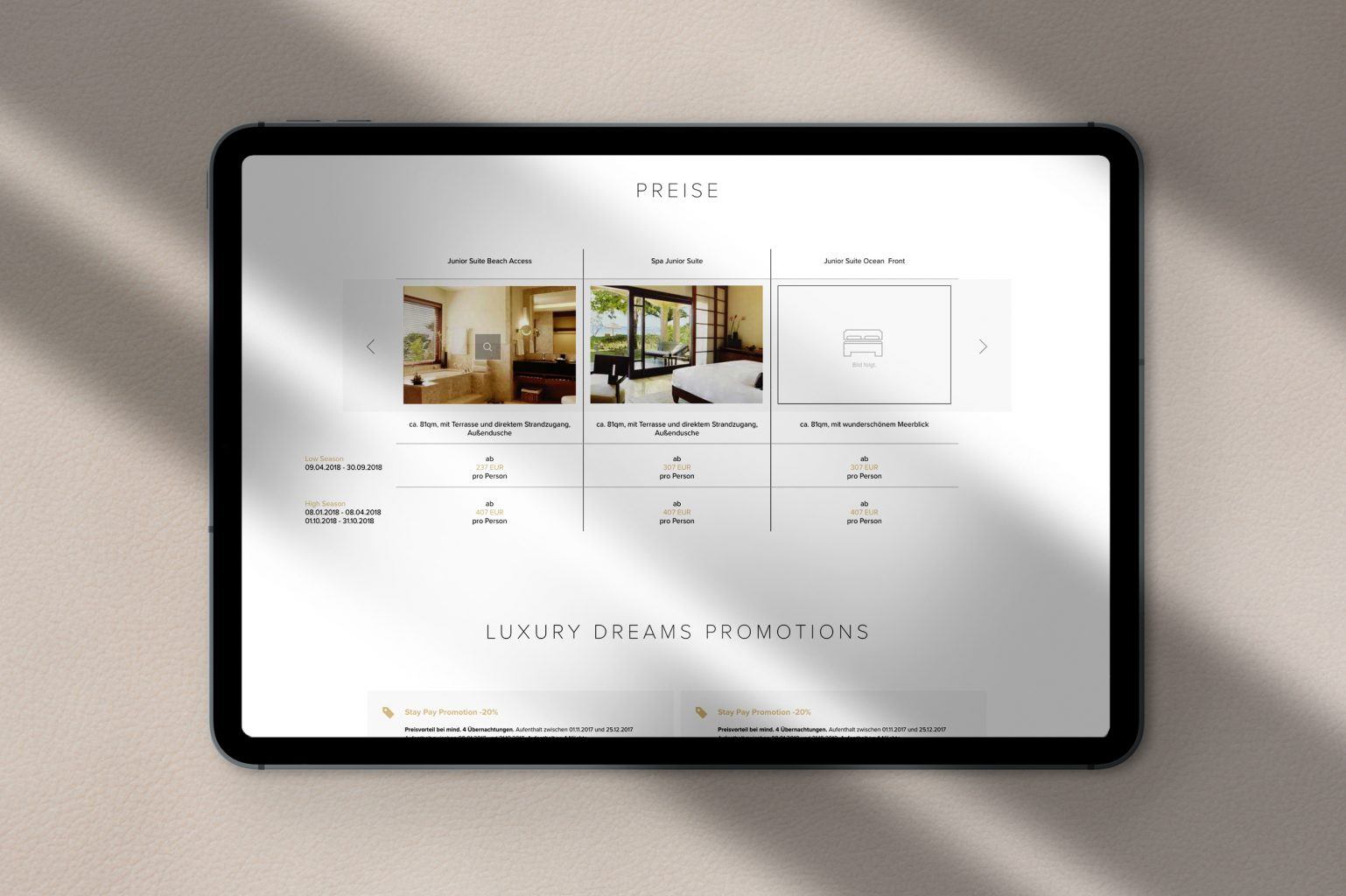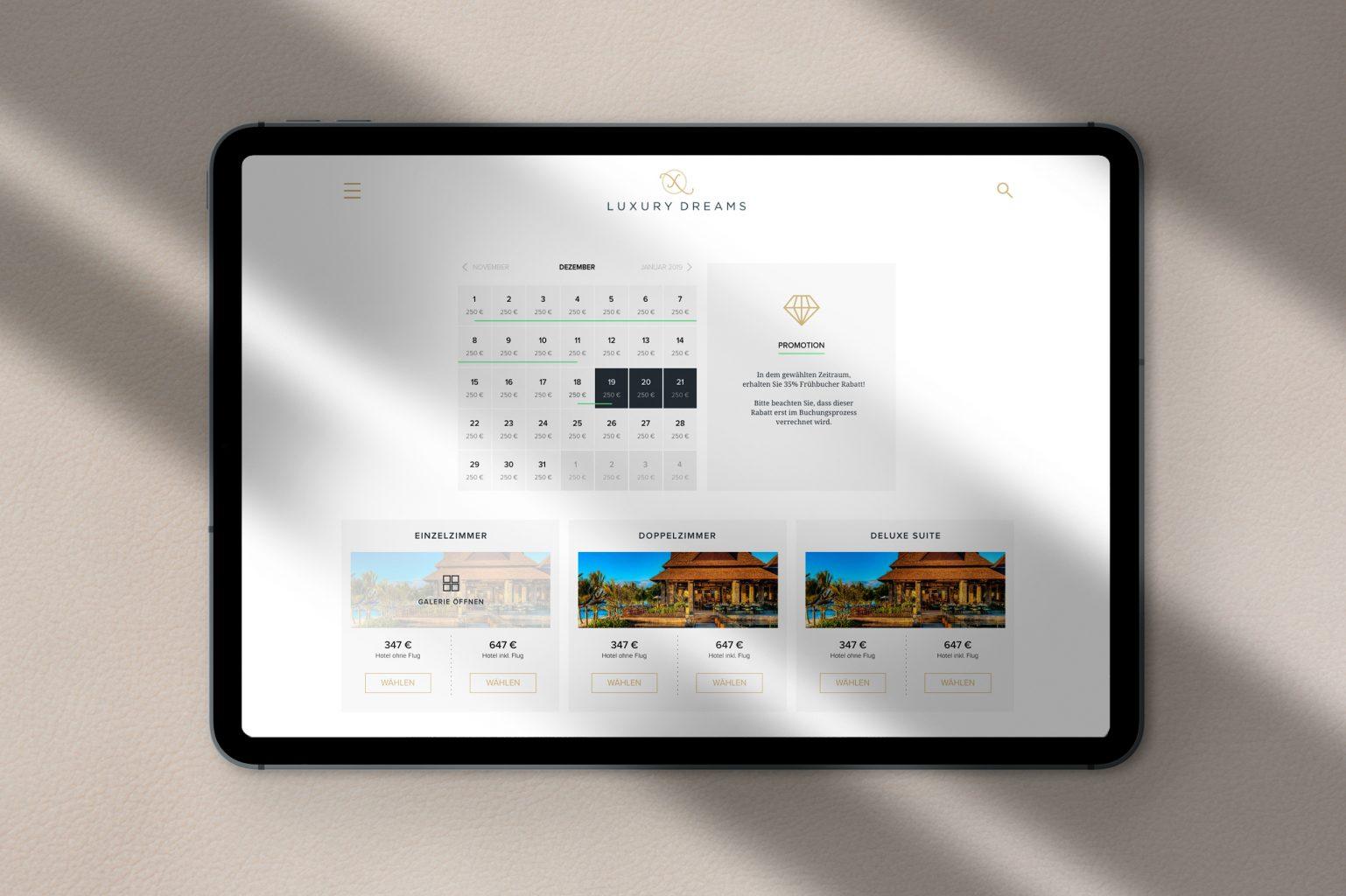 Selbstverständlich hörte unser Doings aber nicht nur im reinen Branding für LUXURY DREAMS auf. Ebenfalls von uns abgedeckt: Das gesamte Webdesign für den Reiseanbieter. Neben „hübschen Reisefotos“ gehört gerade die Hotel- sowie Flugbuchung zu den größeren Herausforderungen der neuen Webseite – damit einhergehend wurden von uns auch diverse Filterseiten, Maps, Datapicker und Co. gestaltet. Ferner wurde das fertige Webdesign von pixelperfektion auch noch in HTML, CSS und mit subtilen Animationen pixelperfekt an die Hauseigene Entwicklung zur nahtlosen Implementierung übergeben.