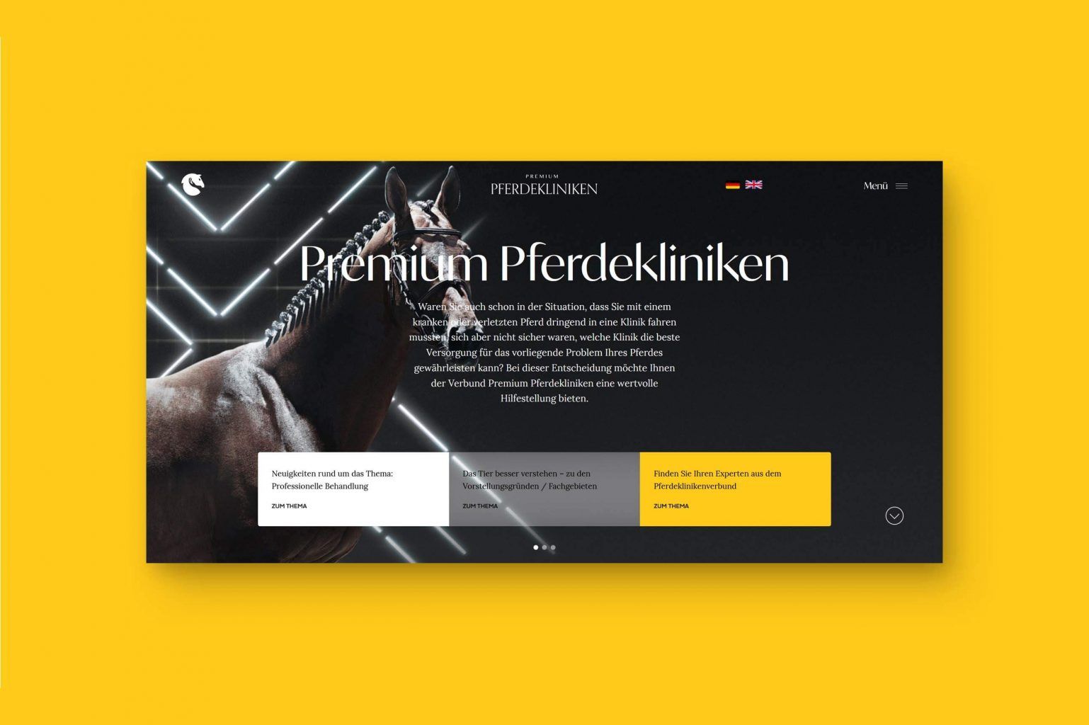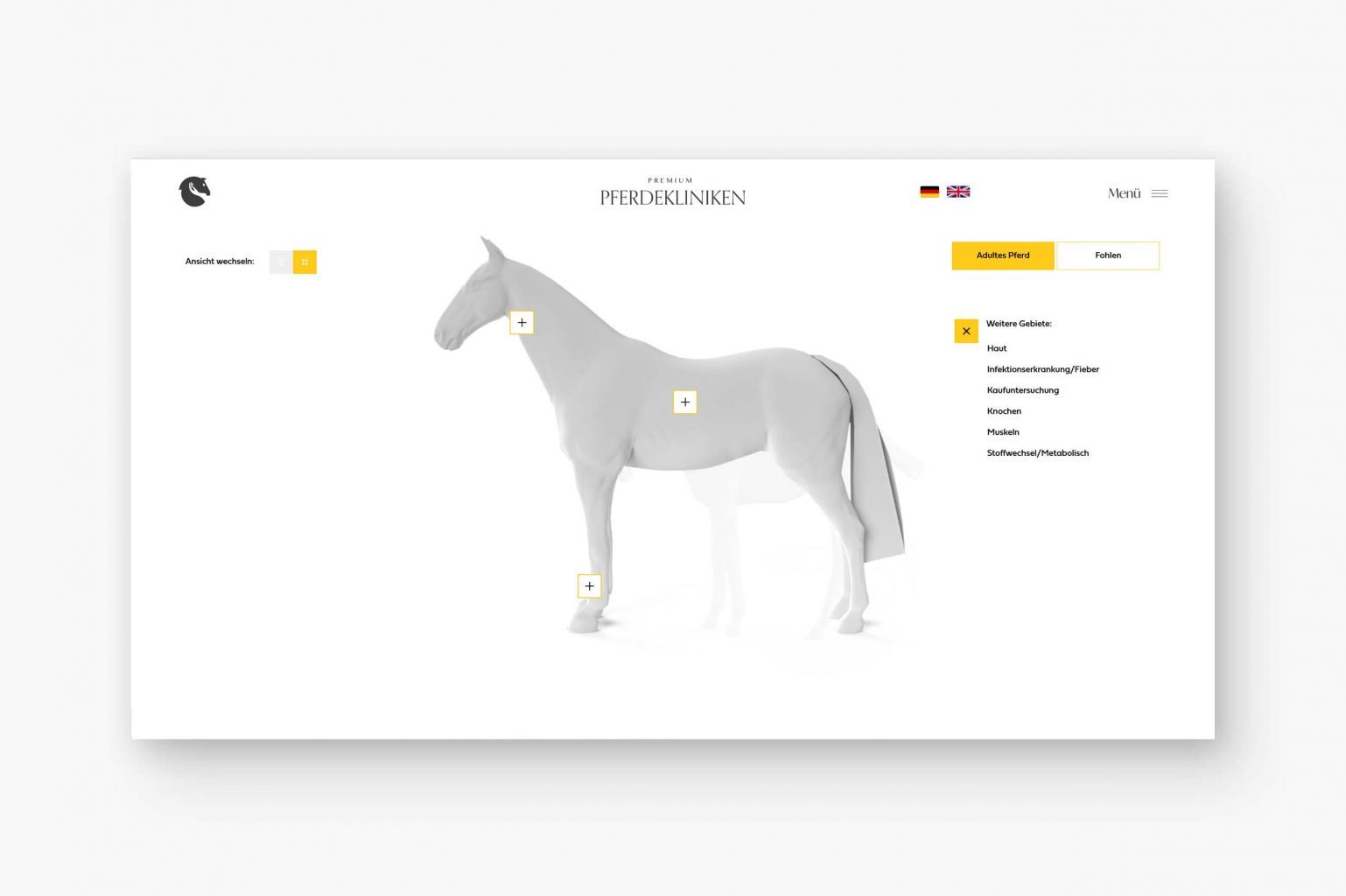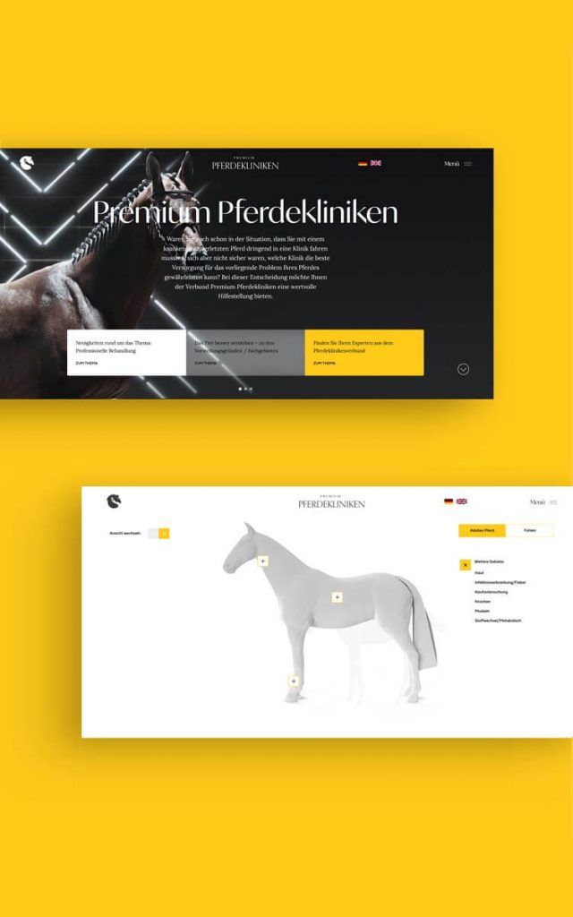 Zentrales Element der Webseite stellt die Navigation der Behandlungssuche dar – dabei modellierten wir in 3D ein abstrahiertes Pferd, mit welchen sich nun der User bequem zu den Bereichen navigieren kann. So kommt der User zu den Behandlungsgebieten und von dort zu den jeweiligen Spezialisten. Dort erwartet den User ein Eintrag, der sogar ein Rating-System bereithällt. So weiß jeder Besucher direkt, welcher Spezialist für welchen Bereich absolut geeignet ist und kann so entscheiden, wo das eigene Tier behandelt wird.
