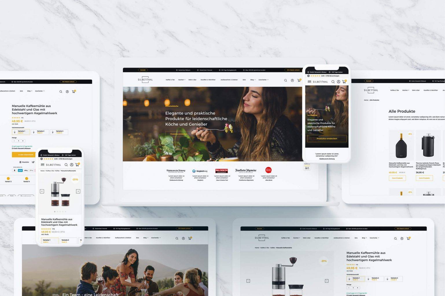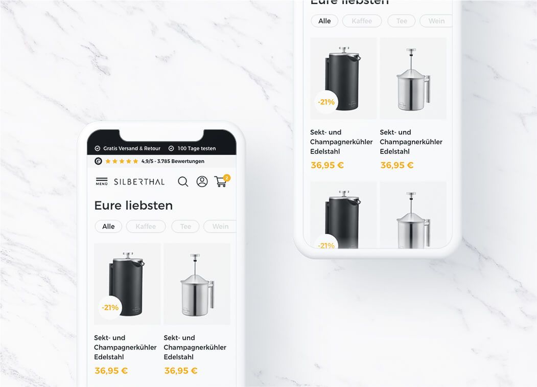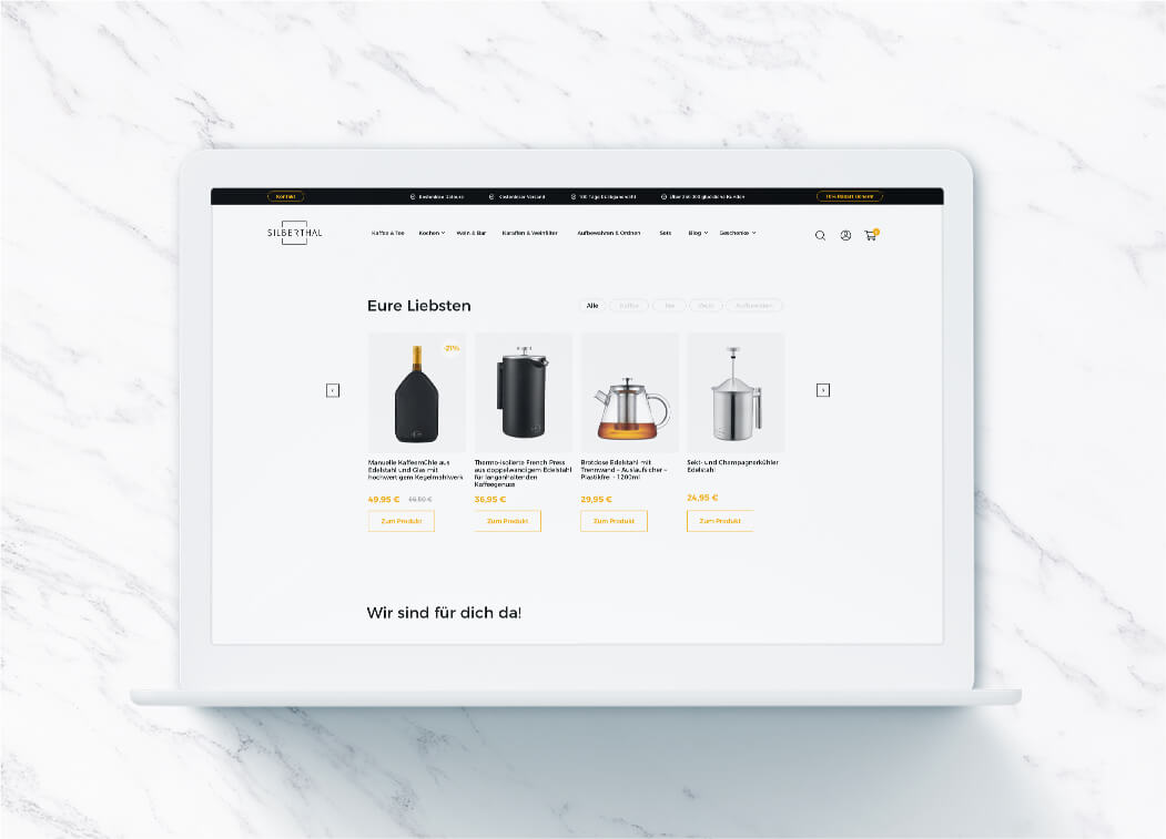 Das Shop-Design wurde Mobile-First entwickelt und deckt diverse, klassische Shop-Bereiche ab, wie die Startseite, ein intuitives Menü, die Produktdetailseiten, Kategorie-Pages oder auch die About-Page für Silberthal ab. Auch die Sitecart und der Warenkorb selbst wurden von uns gestaltet – lediglich der Checkout-Prozess ist Shopify-bedingt standardisiert und bekam nur eine CI-Anpassung. Die Entwicklung der Shopify-Shops wurde durch die GWA abgedeckt.