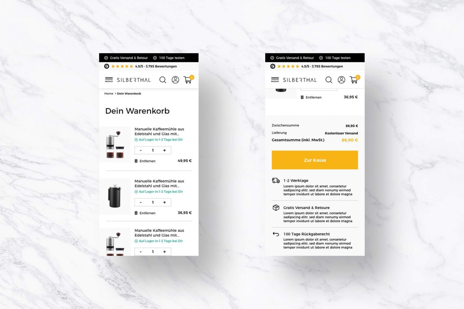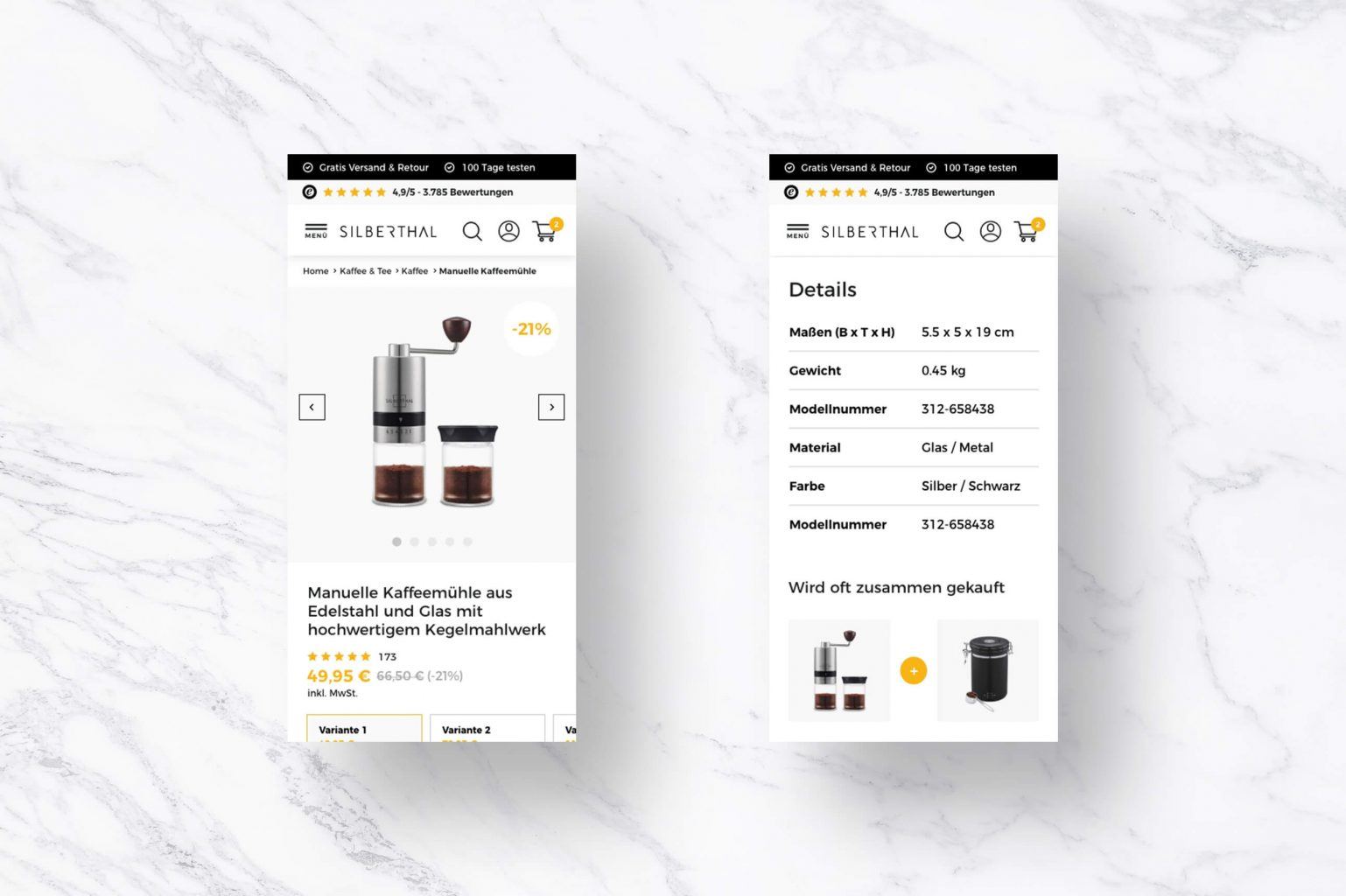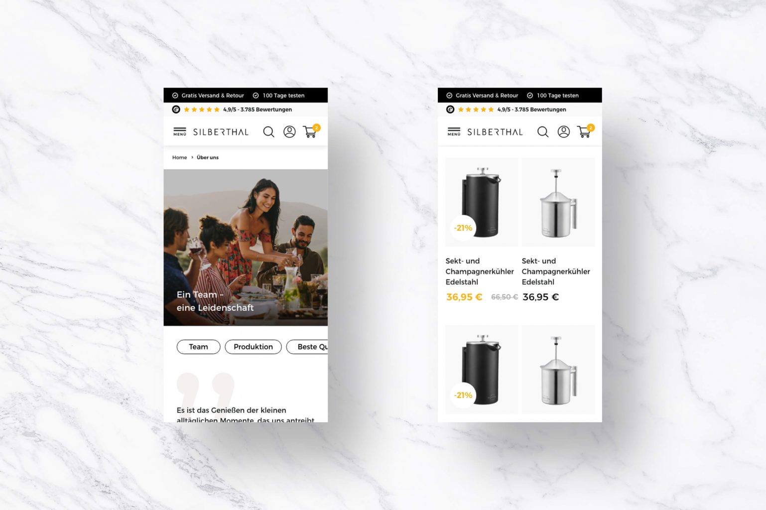 Das Shop-Design wurde Mobile-First entwickelt und deckt diverse, klassische Shop-Bereiche ab, wie die Startseite, ein intuitives Menü, die Produktdetailseiten, Kategorie-Pages oder auch die About-Page für Silberthal ab. Auch die Sitecart und der Warenkorb selbst wurden von uns gestaltet – lediglich der Checkout-Prozess ist Shopify-bedingt standardisiert und bekam nur eine CI-Anpassung. Die Entwicklung der Shopify-Shops wurde durch die GWA abgedeckt.