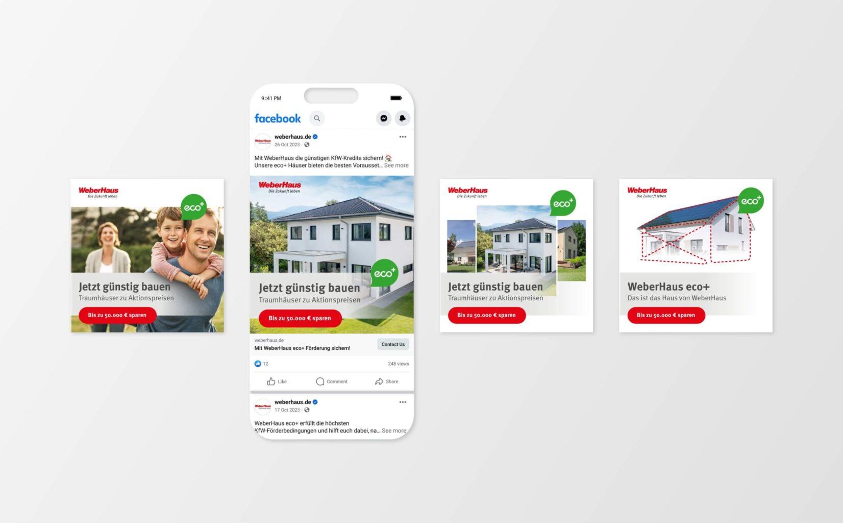Explizit ging es bei den Meta-Ads um die Bewerbung der Aktion „eco+“, die es ermöglicht, ökologische Fertighäuser zu bauen und sich gleichzeitig dabei Aktionsvorteile zu sichern. Dabei entstand eine Ideen-Sammlung von acht verschiedenen Richtungen, die der Kunde überliefert bekam. In diesem Zuge sind gleich mehrere Entwicklungen freigegeben worden, die letztendlich auch von unserem Design-Team visualisiert wurden.