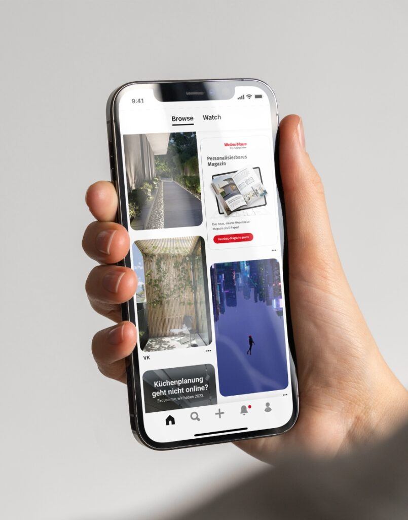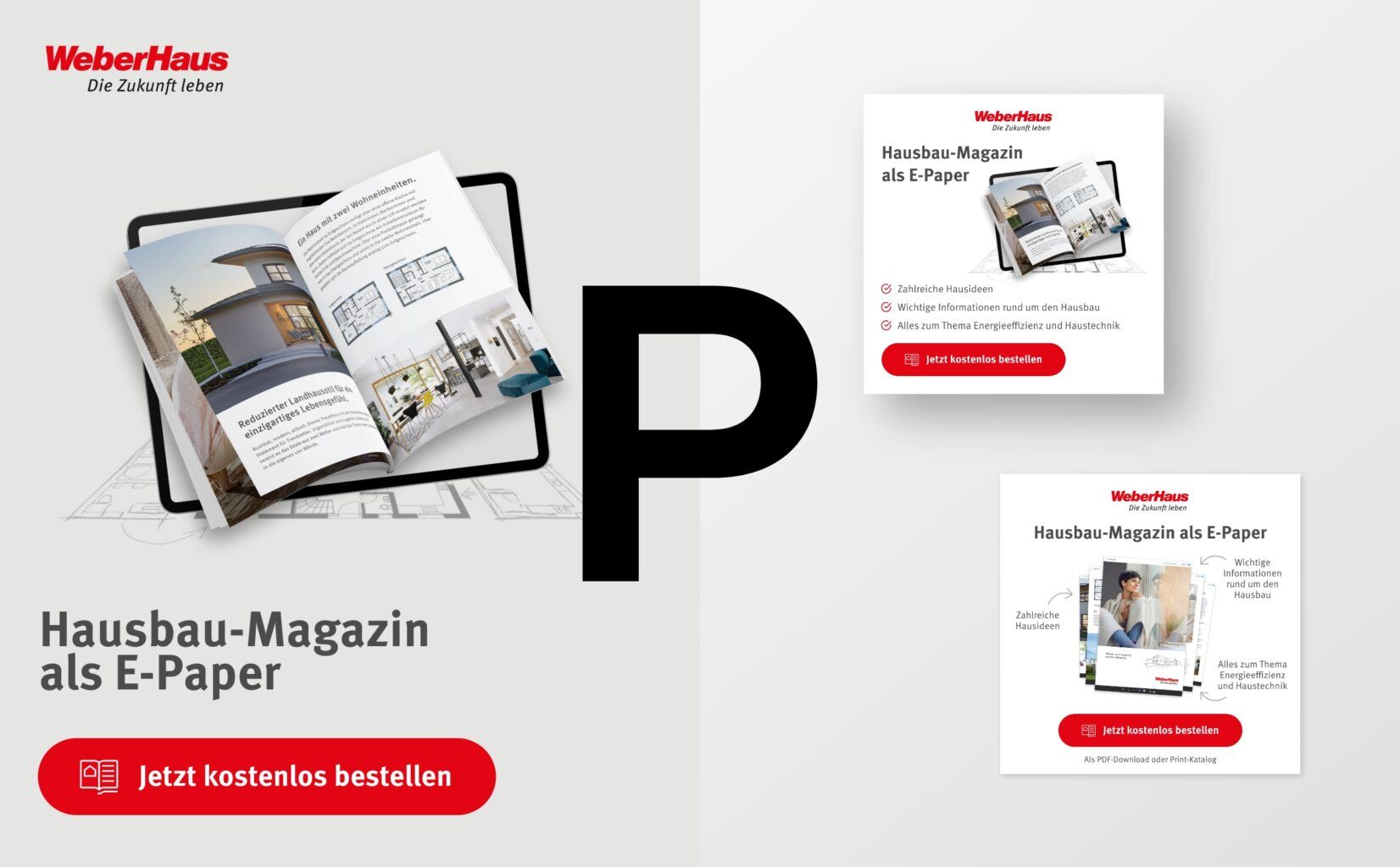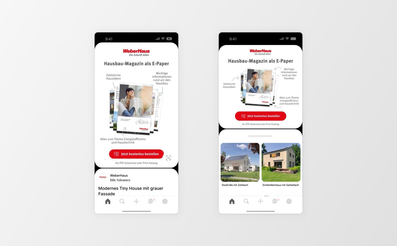 Bei den Pinterest-Ads lag der Fokus auf der Bewerbung von Downloadmaterial, konkreter auf dem Hausbau-Magazin von WeberHaus. Auch hier überlieferten wir ebenso mehrere konzeptionelle Richtungen als Vorschläge, wovon im ersten Schwung mehrere dieser abgenommen wurden.